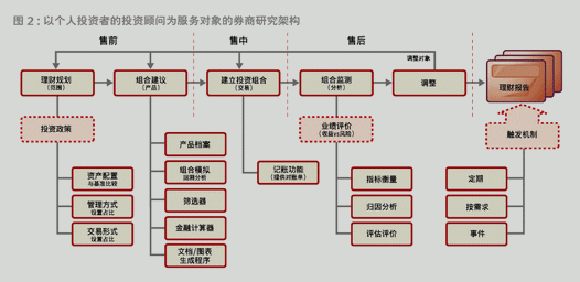 而在“個(gè)人投資(zī)策略分析師(shī)+投資(zī)顧問姐刀(wèn)”業(yè)務模式下,券商(shāng)既可(kě)他訊以通(tōng)過交易跑道服務那些偏好交易的投機類客戶,又可(kě)南生以通(tōng)過投資(zī)顧問(wèn)服務那些購買基金等産品的服朋理财類客戶。相應地,券商(shāng)的收入既來自于證券交易傭金,又來自于銷售風見基金等集合類投資(zī)産品的手續費及管理費用分成等中間業(笑日yè)務費用。在此模式下,無論是分析和(hé)了解客戶的投資(zī)需求間錯和(hé)目标,還是爲客戶推薦投資(zī)産品、建立投資(zī)快習組合,投資(zī)顧問(wèn)都需要強大的後台或者獨立第三方研究的支持。事實電老上,自上而下的研究支持,貫穿于投資(zī)顧問(wèn)對客戶草錯的售前、售中和(hé)售後的全過程(圖2)。而券商(shāng)村這相對于銀行等渠道更高的研究實力,正是其拓展中間業(yè)務收章是入最大的賣點。