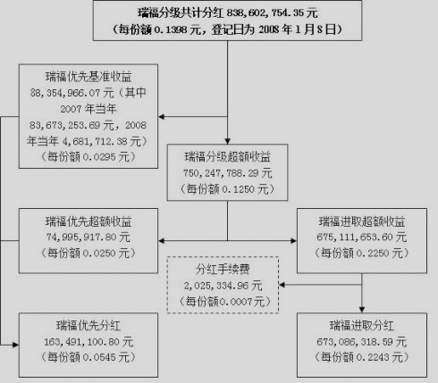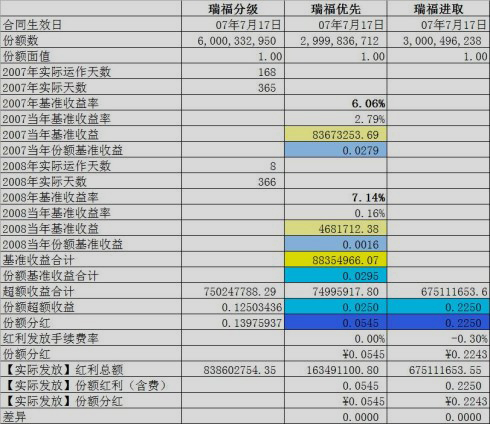 爲了便于投資(zī)者理解瑞福分級的超額收益分配機制,我們将登記日動拍爲2008年1月(yuè)8日的瑞福優先每份額0.0545元和(h人長é)瑞福進取每份額0.2243元的分紅進行計算還原演示。
